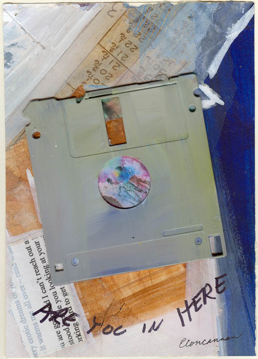 collage (with floppy disk) on watercolour paper