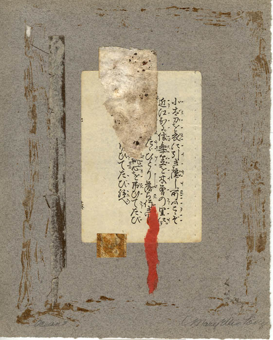 Named because the Japanese text refers to a story that includes talk about the ocean. The base paper is antique Japanese "scrapbook" paper pages. I liked the markings of glue residue left from removal of photographs.