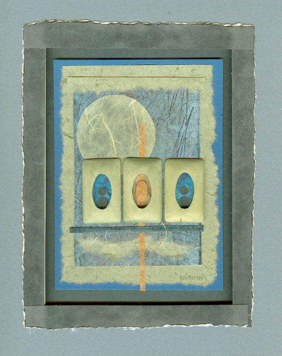 collage on matboard, 'framed' with handmade paper, fabric & matboard on foamboard spacer
