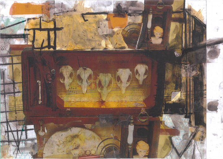 Print from multi-layered collage and paint on transparency, printed on art paper