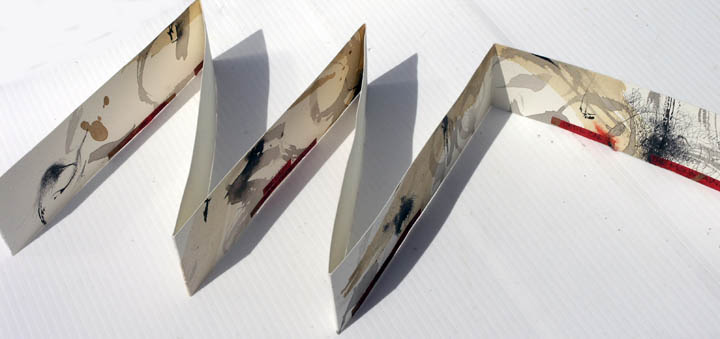 written on a big sheet of Arches - with a found eagle feather - then cut into long narrow strips and folded into concertina books, adding pen drawings and collage elements