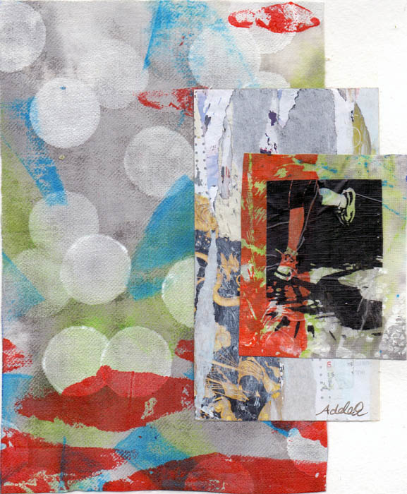 Photo image transfer on fabric, found paper, fabric paint stamped on fabric, mounted on watercolour paper