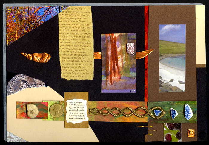 collage (paper & pottery shards & fossils shell & coin & metal) on matboard