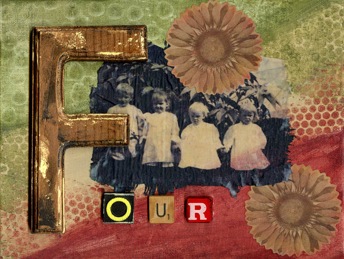 collage (acrylic gel transfer & wooden blocks) on canvasboard