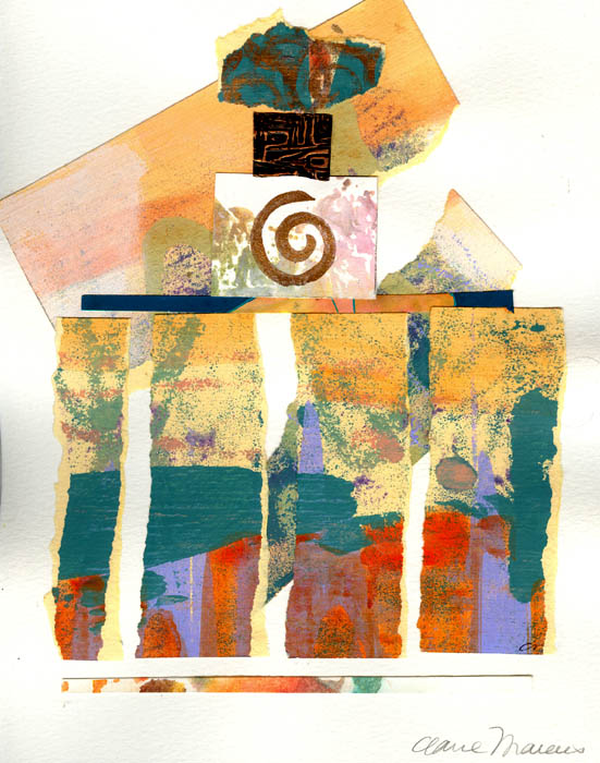 These collages are from my original mixed media paintings and monotype prints that didn't quite make it. These papers painted with acrylic and printed with oil paint have great color, texture and patterns that inspire me to continue to work with them.