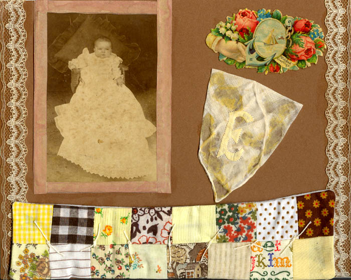 collage (with photograph, lace, fabric & patchwork) on matboard