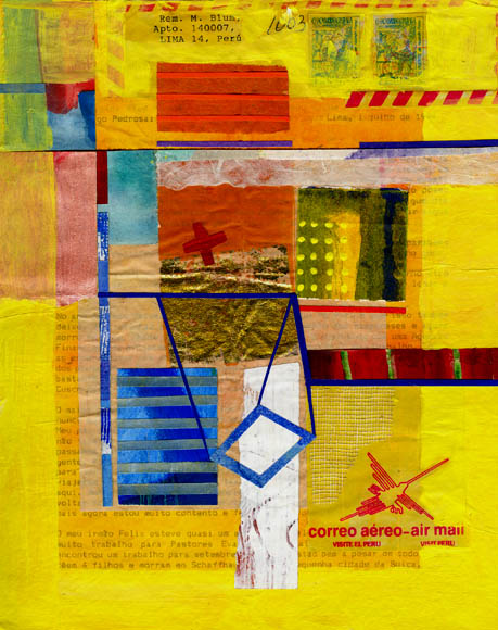 | The series is titled Letters from Abroad as I tried to capture memories from time, people and places. Living for some time abroad I started to keep letters being received, and in return to my own country I continued doing so. In order to preserve the letters but at the same time trying to disguise its contents, I decided to work on them as a support. Collage was a most appropriate medium. |