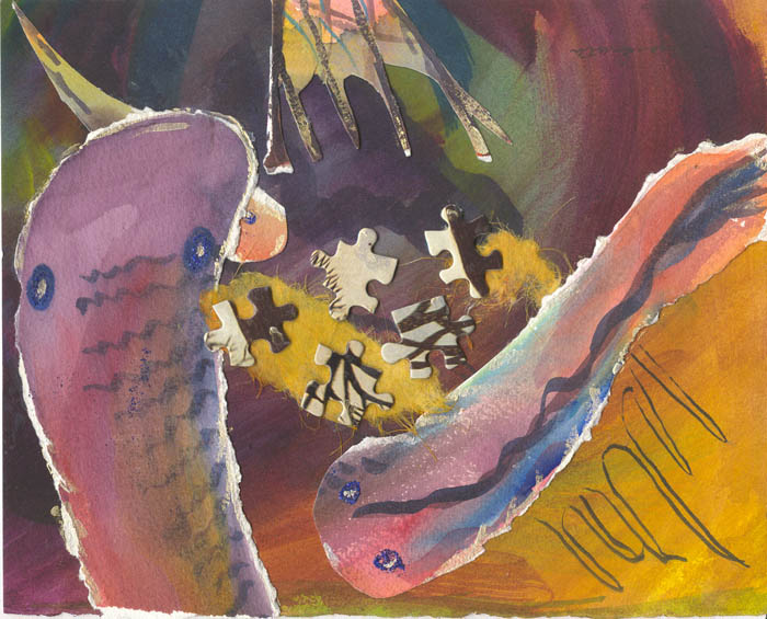 collage of watercolour paper and jigsaw pieces, on watercolour paper