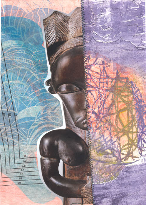 collage with stitching on watercolour paper