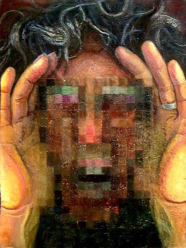 From scan of face - identity masked with pixels - Self hidden by the flow of information.