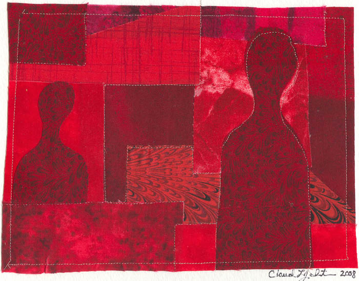 fabric collage with stitching on watercolour paper