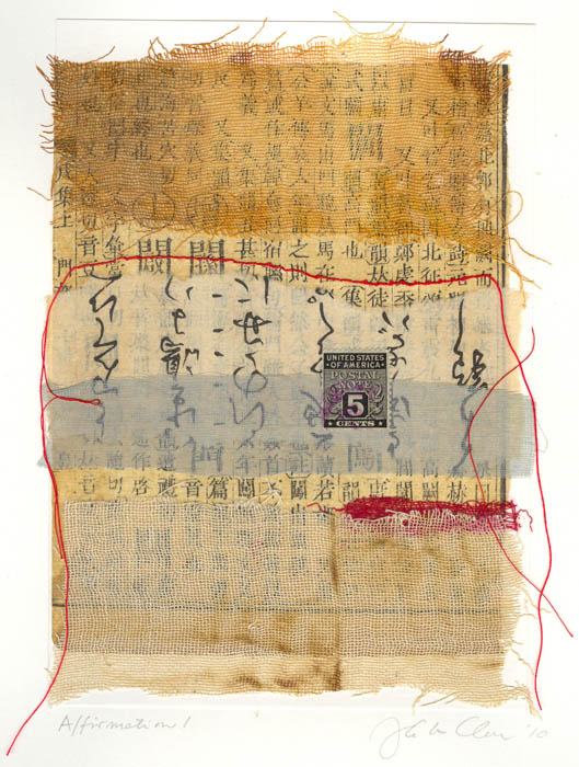 collage with stitching on thick watercolour paper