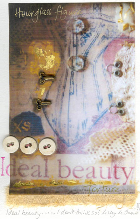 Re-collaged image, with real gold leaf, old buttons & hooks, on watercolour paper