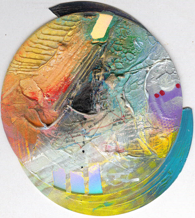 Broken CD + resin, spray paint, image transfer etc, on CD