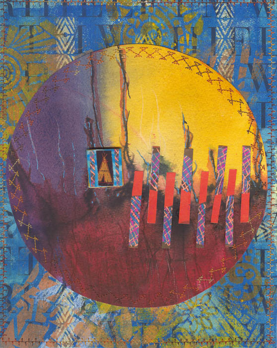 collage with stitching on watercolour paper