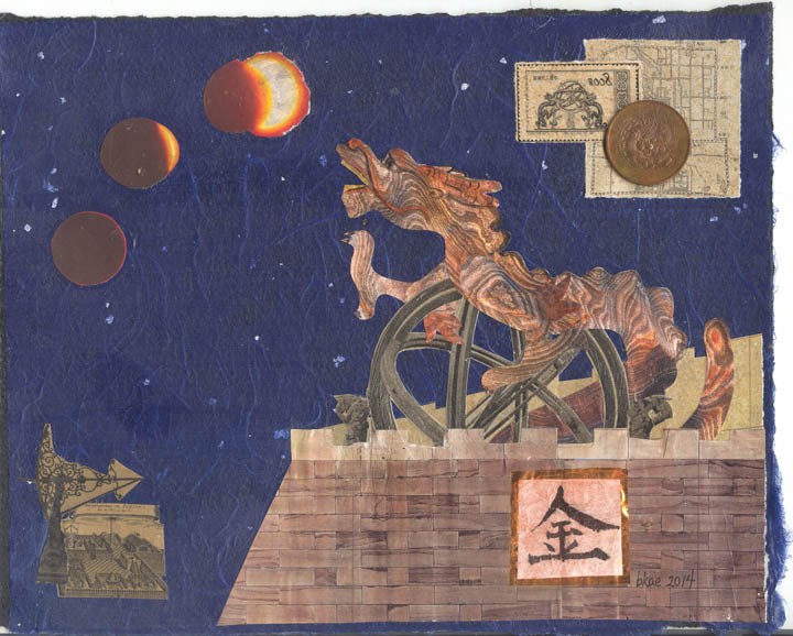 Metal along with wood, fire, earth, and water comprise the 5 Chinese elements. A metal dragon is honest, tough and always looking for action. All dragons are considered symbols of good fortune like the old Chinese coin. This metal dragon perches on an armillary sphere on top of the Ancient Beijing Observatory built in 1442. Metal dragons were born in 1940 and 2000. The Chinese character near the bottom is translated as "metal" or "gold".