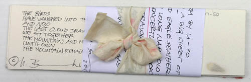 written on a big sheet of Arches - with a found eagle feather - then cut into long narrow strips and folded into concertina books, adding pen drawings and collage elements