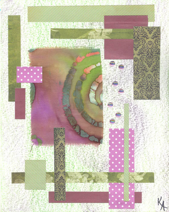 collage of paper, batik fabric and small adhesive 'jewels', on art card