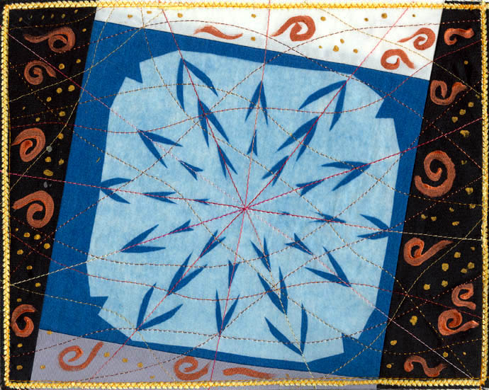 Cyanotype on silk, fabric, stitching, paint, on watercolour paper