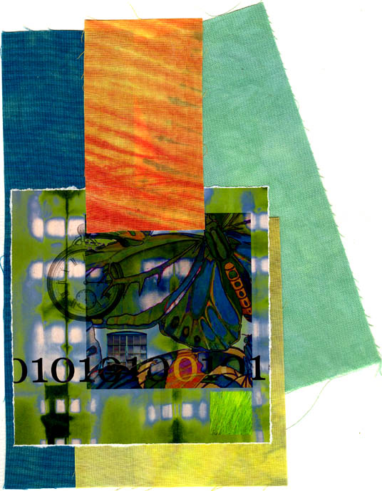 collage of printed paper and fabric on watercolour paper
