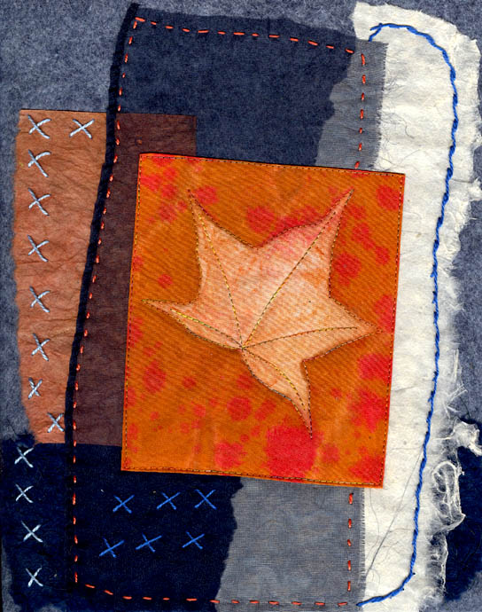 "Endless Autumn" series, heliographic prints on cotton, fabric, paper, stitching, on wool felt, mounted on mat board.